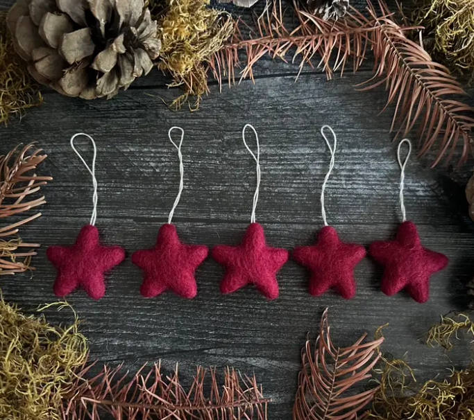 A felted star ornament, for holiday decoration. It is needle-felted and each hangs from a loop of cotton string. The stars measure about 1-1.5" across and are intentionally non-uniform for a more organic look.